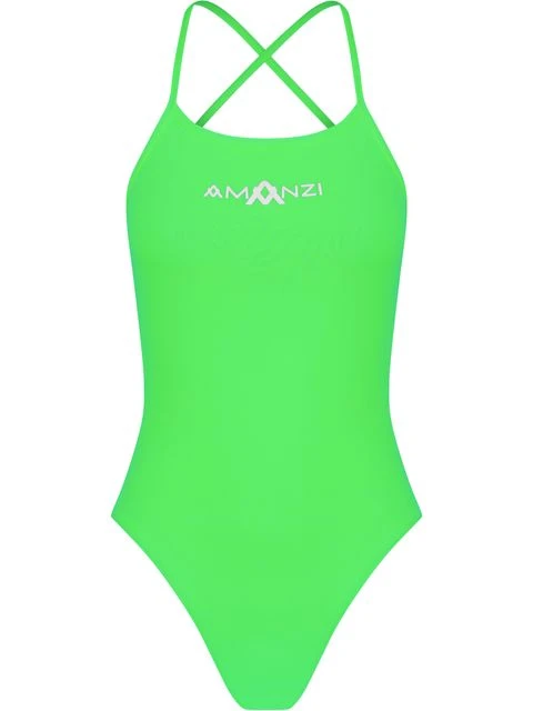 The Zesty Tie Back One Piece Swimsuit is an all purpose training swimsuit with a fashion edge. Ideal for both competitive and active pool and surf swimmers. The thin tie back straps are fully adjustable to provide the perfect fit. The wide open back follows the natural contours of the body providing an ergonomic fit and superior comfort. The high leg height provides a skimpier fit ideal for those wanting less coverage. All tie backs feature the signature AMANZI logo on the chest and the A logo on the lower back.
