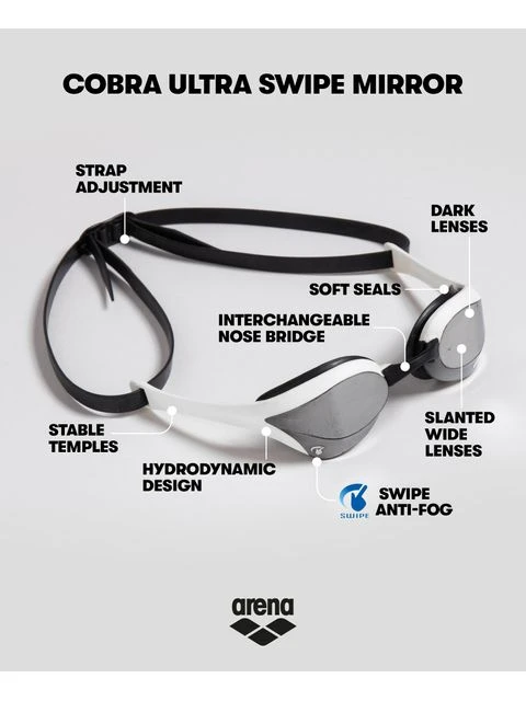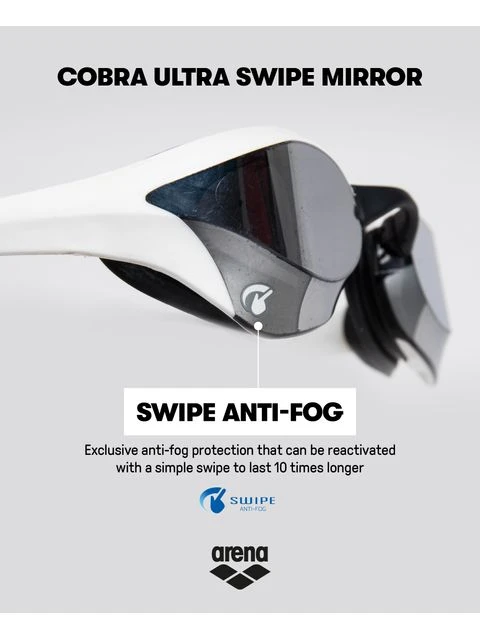 The ground breaking new Anti-Fog Swipe Technology solves the problem of goggles that fog up. The Cobra’s exisitng anti-fog treatment is already one of the best, but with the Swipe Technology Arena has made the Cobra Ultras even better. With just a single swipe of the finger, the Swipe Ant-fog can be reactivated, extending the anti-fog protection up to 10 tmes longer. When goggles become foggy, gently wipe the inner lenses with your fingertip while the goggles are in the water and enjoy clear vision for longer.