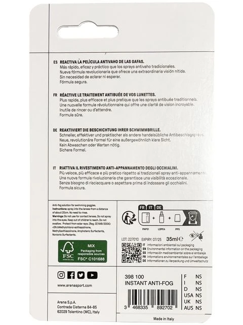 The Arena Instant Anti-Fog Spray & Swim is designed to reactivate your goggles anti-fog coating. Fast-acting, effective and practical, this revolutionary formula delivers extraordinary clarity of vision. Spray onto the inside of your goggle lenses and you’ll be swimming fog free in seconds.Â
