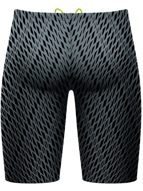 The Q Swimwear Jammers – Rapid have a sleek black and grey geometric print. The jammers have a bright drawstring waistcord and a Q Swimwear logo printed on the lower front leg.