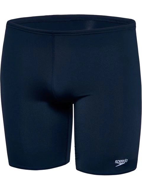 The Speedo Basic Jammers Boys – Navy are solid black with an embroidered Speedo logo on the front leg and an Endurance+ logo on the back hip.Â