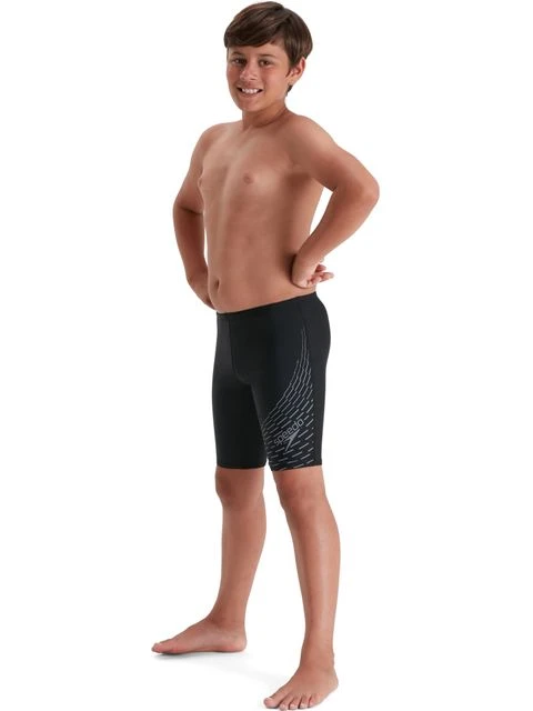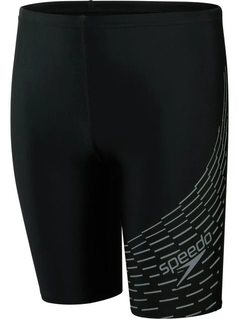 The Speedo Jammers – Medley Logo Black/Ardesia is a sporty style featuring a subtle kinetic wave print design and an internal drawcord which allows young swimmers to adjust the fit. The jammer includes a front lined panel for added comfort and modesty. The Speedo ECO EnduraFlex fabric offers higher chlorine resistance than standard swimwear fabrics and fits like new for longer with CREORA® HighCloâ„¢. Made from 100% recycled waste fabric, so its better for the environment too.