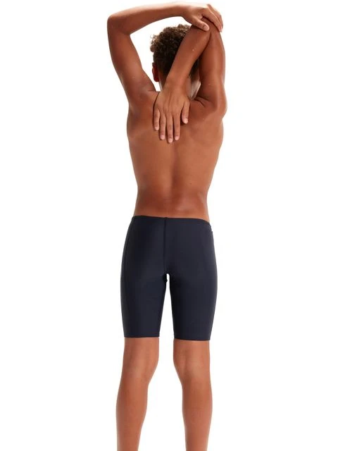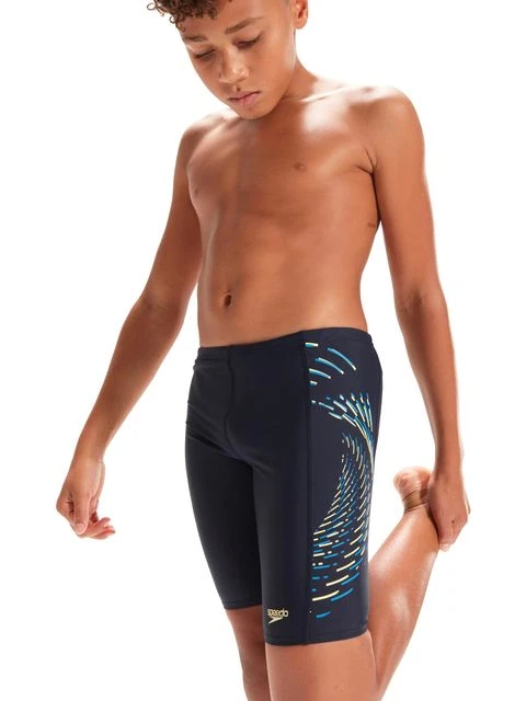The Speedo Jammers – Navy/Bondi Blue/Spritz is everything your child needs for a great swim. Featuring a red and grey ‘cresting wave’ plastisol graphic, this sleek-looking black Jammer is stylish and understated. Ideal for training, lessons and fun in the pool, it’s lined at the front for comfort and modesty and includes an internal drawcord to allow young swimmers to adjust the fit. Providing higher chlorine resistance than standard swimwear fabrics, the jammer offers excellent shape retention and fits like new for longer with CREORA® HighCloâ„¢. If you’re looking for great eco-credentials, it’s got those, too: the exclusive Eco EnduraFlex fabric is made from 100% recycled pre-consumer waste, such as fabric waste from factories.