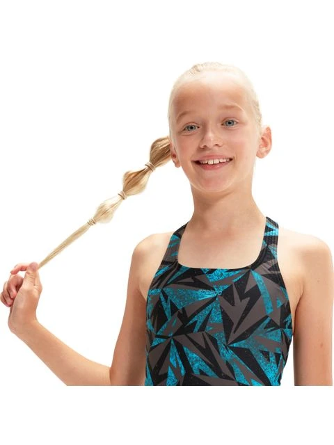 The Speedo Medalist One Piece – Bolt/Dove Grey will make a statement at the pool with the iconic Speedo boom logo print. Celebrating the Speedo brand, the sporty girls’ Medalist swimsuit showcases the Speedo iconic Boom logo in a ‘shattered’ print design with intense shades of lilac and navy. Ideal for regular pool sessions, the medalist design aids shoulder movement and flexibility so young swimmers can cruise through their swim without feeling held back. The suit is also fully lined at the front for comfort and modesty during their swim. Soft and stretchy fabric make it ideal for regular swimming, while the shape-retaining Endurance10 fabric with CREORA® HighCloâ„¢ ensures it fits like new for longer.