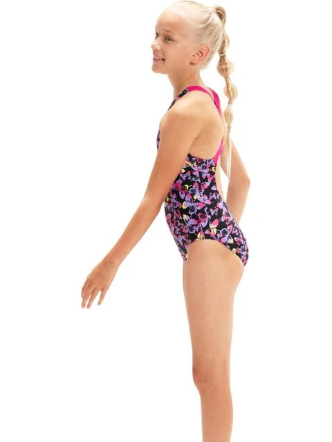 The Speedo Medalist One Piece – Rose Violet/Miami Lilac will help you take on training and lessons wearing this eye-catching Medalist suit, which includes a vivid butterfly print in shades of violet and lilac. Perfect for training, the medalist style includes back straps that sit between the shoulder of young swimmers, aiding their movement and flexibility. Providing higher chlorine resistance than standard swimwear fabrics, the swimsuit offers excellent shape retention and fits like new for longer with CREORA® HighClo. If you’re looking for great eco-credentials, it’s got those, too: the exclusive Eco EnduraFlex fabric is made from 100% recycled pre-consumer waste, such as recycled fabric waste from factories.