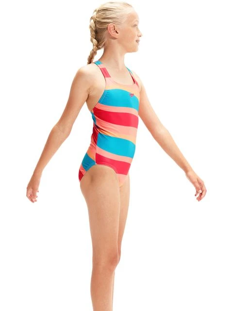 The Speedo Medalist One Piece – Soft Coral/Aquarium will ensure summer comes with you wherever you go wearing this colourful pastel Medalist swimsuit, inspired by the sun-bleached colours of sunny Bondi Beach. Perfect for training and lessons, the medalist style includes back straps that sit between the shoulder of young swimmers, aiding their movement and flexibility. Taking them from beach to pool, the Speedo ECO EnduraBrite fabric offers superb colour performance, so you can enjoy the swimsuit’s sunny colours for longer. Providing higher chlorine resistance than standard swimwear fabrics, the swimsuit fits like new for longer with CREORA® HighClo™ and is made from 100% post-consumer waste, such as plastic bottles.