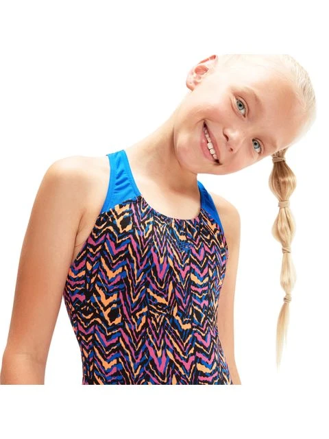The Speedo Splashback One Piece – Blue Flame/Boost Orange will add some zing to your swim with this striking Splashback swimsuit’s tribal-style multi-colour print. Perfect for swimming lessons, the splashback straps are set away from the shoulders to increase freedom of movement, allowing young swimmers to move without feeling restricted. Designed to be durable and better for the environment, it’s made from the new Speedo ECO Endurance+ fabric, which is 100% chlorine resistant, quick-drying and made from 50% recycled materials.